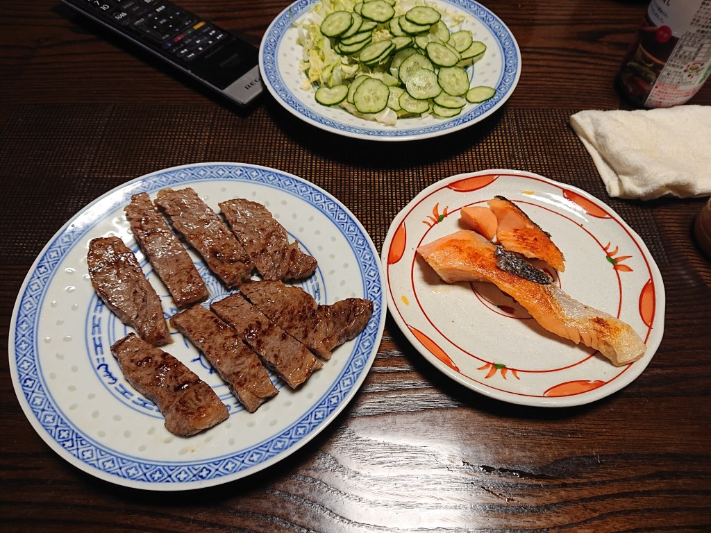 あと、肉だけでは足りないと思い、スーパーのシャケを焼きました。