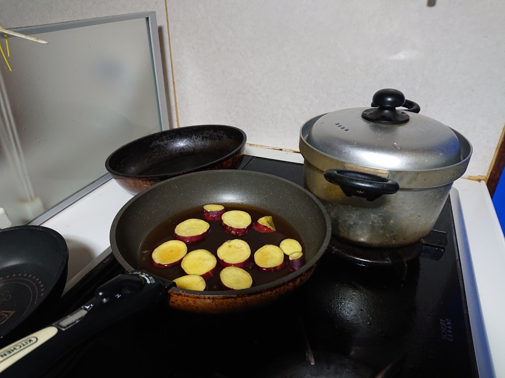 事務所から戻って台所に入ったら甘い匂いがしたので、見てみたら、さつま芋の煮物でした。