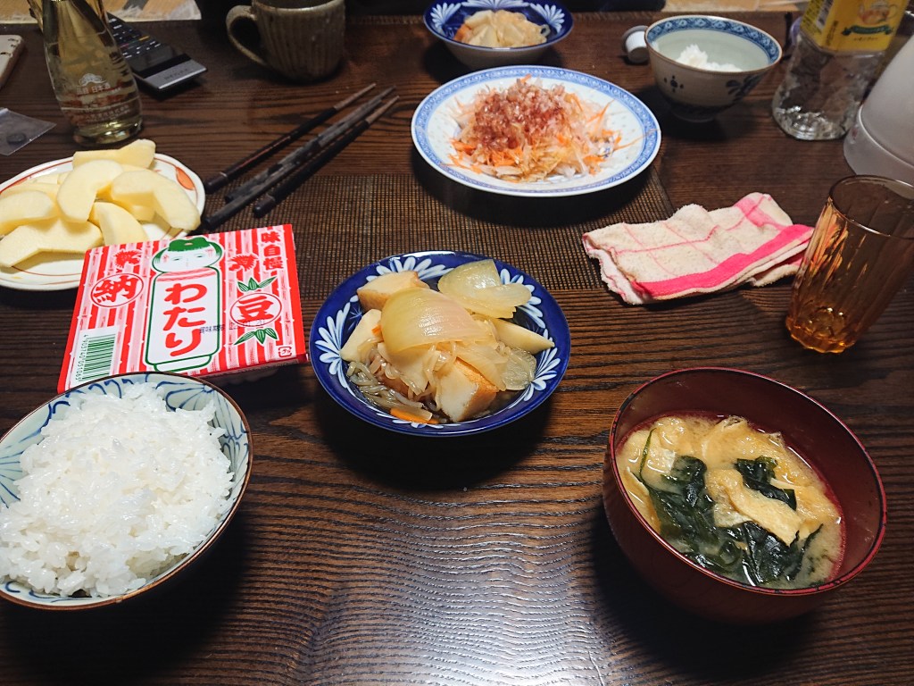 昨日の夜は、煮物と生野菜とわたり納豆でした。