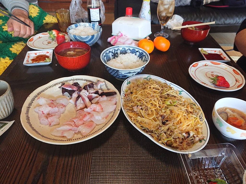 昼食は、前日の鍋の残りとパスタ、それからヒラメ、タコ、エビの刺身でした。
