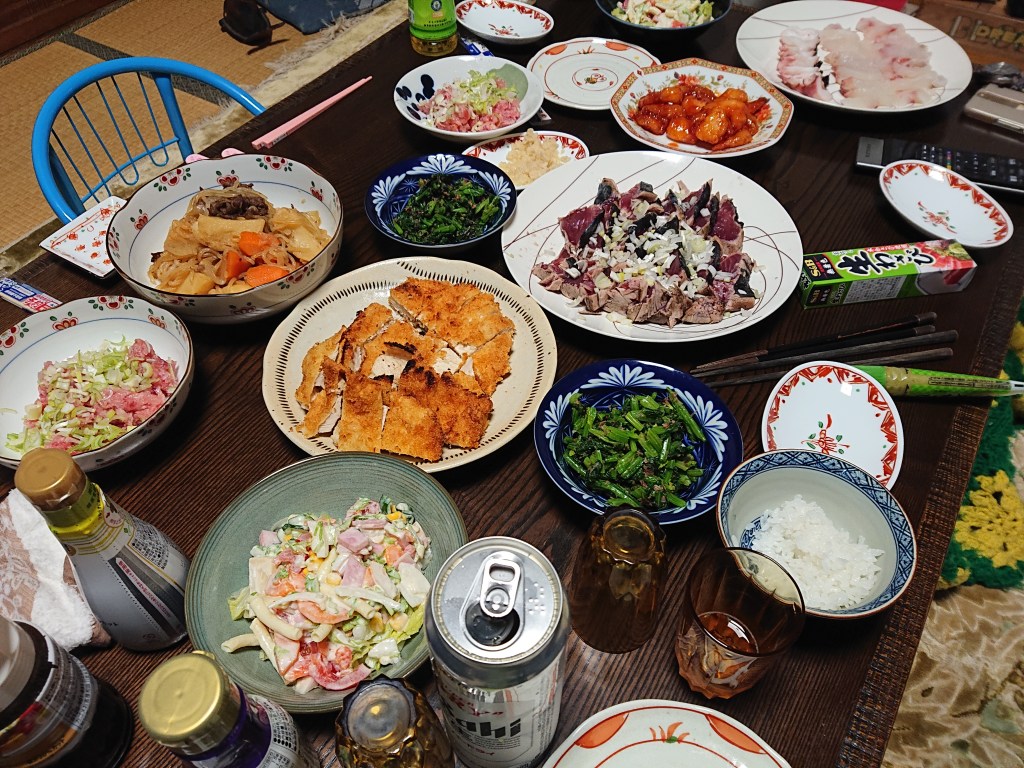 刺身、チキンカツ、エビチリ、肉じゃがなど、盛りだくさんでした。