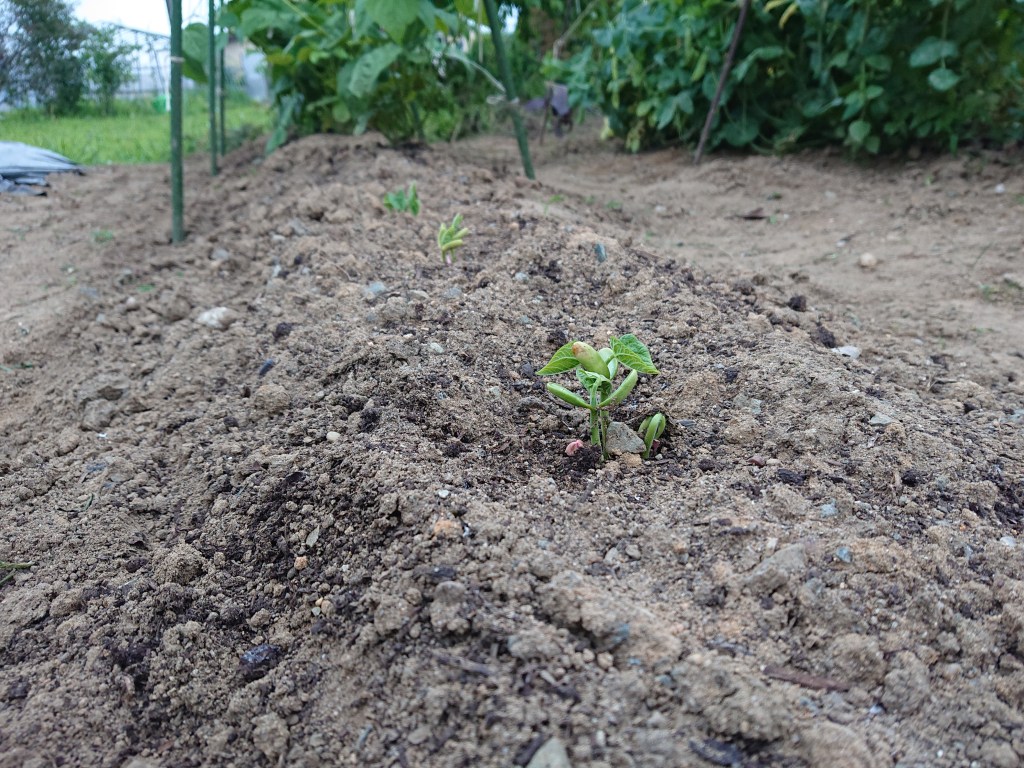 また、空いている所に、新しくサヤインゲンの種を蒔いたのですが、しっかりと芽を出しました。