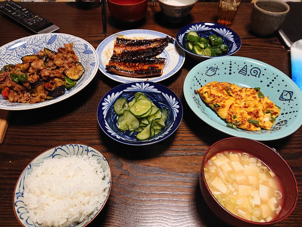 昨日の夕食は、ウナギの蒲焼き、牛肉炒め、玉子焼きでした。