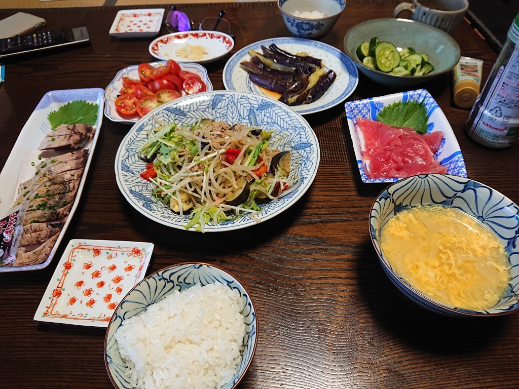 また、ナスの煮浸し、キュウリの漬物、野菜炒め、たまごスープでした。