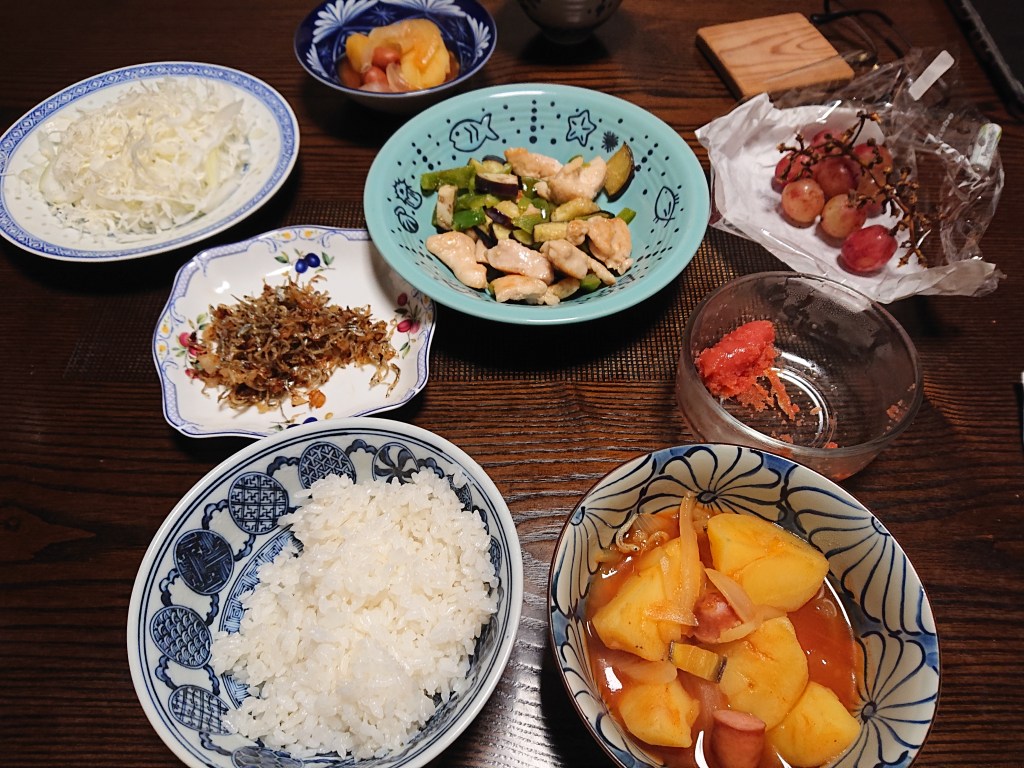 その他に、生野菜のサラダと、煮干しと玉ねぎの炒め物、明太子、ブドウでした。
