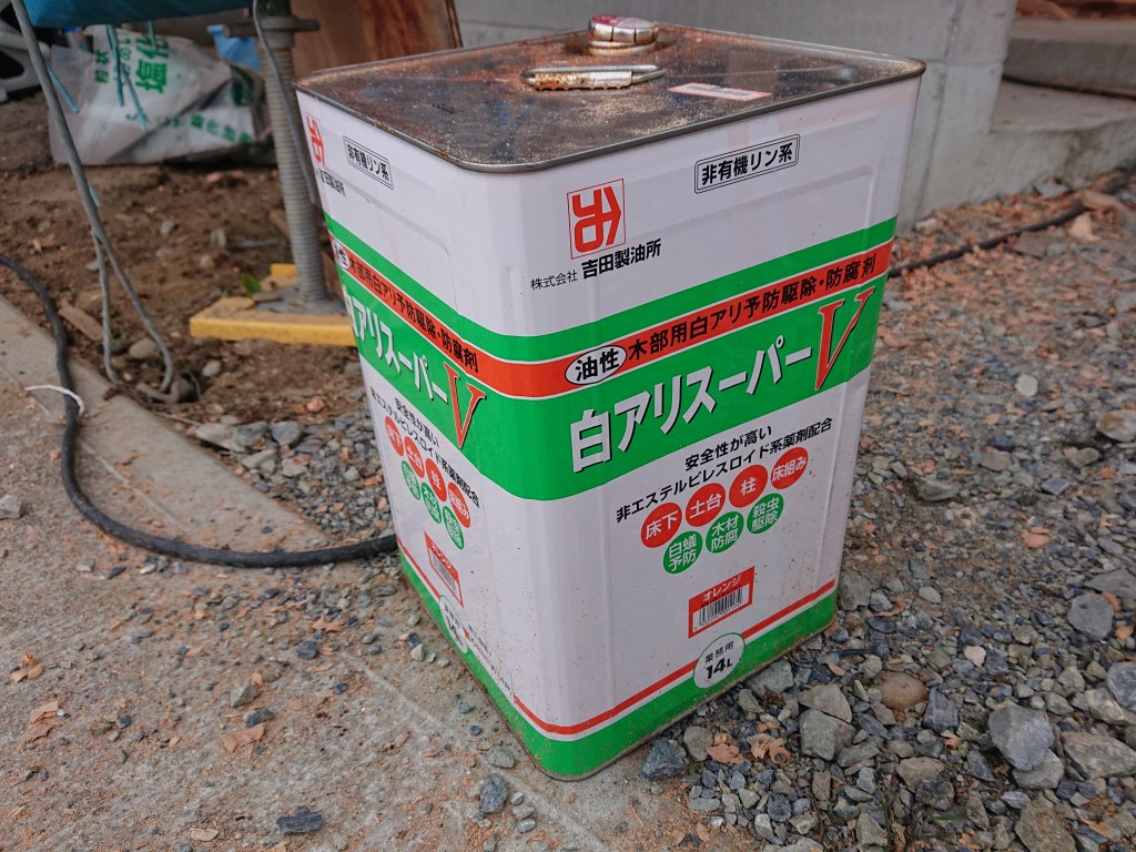 金物で補強した後、今度はシロアリに食われないように防腐剤を塗ってもらいました。