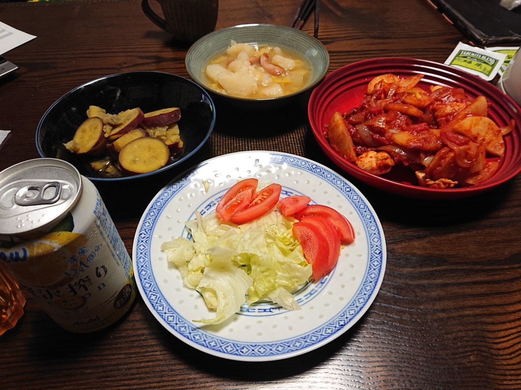 昨日の夕食は、鶏肉のトマト煮、ジャガイモの煮物、さつまいもでした。