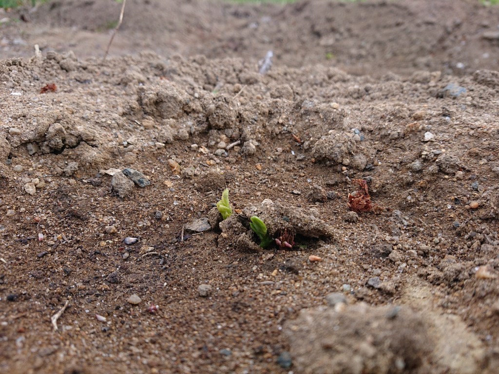先月、畑を耕して、まずはサヤエンドウの種を蒔いたのですが、芽が出てきました。