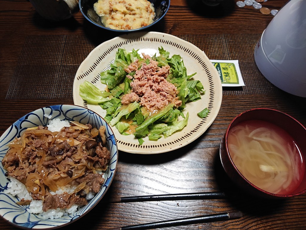 他に、レタスとツナのサラダ、タマネギの汁物でした。