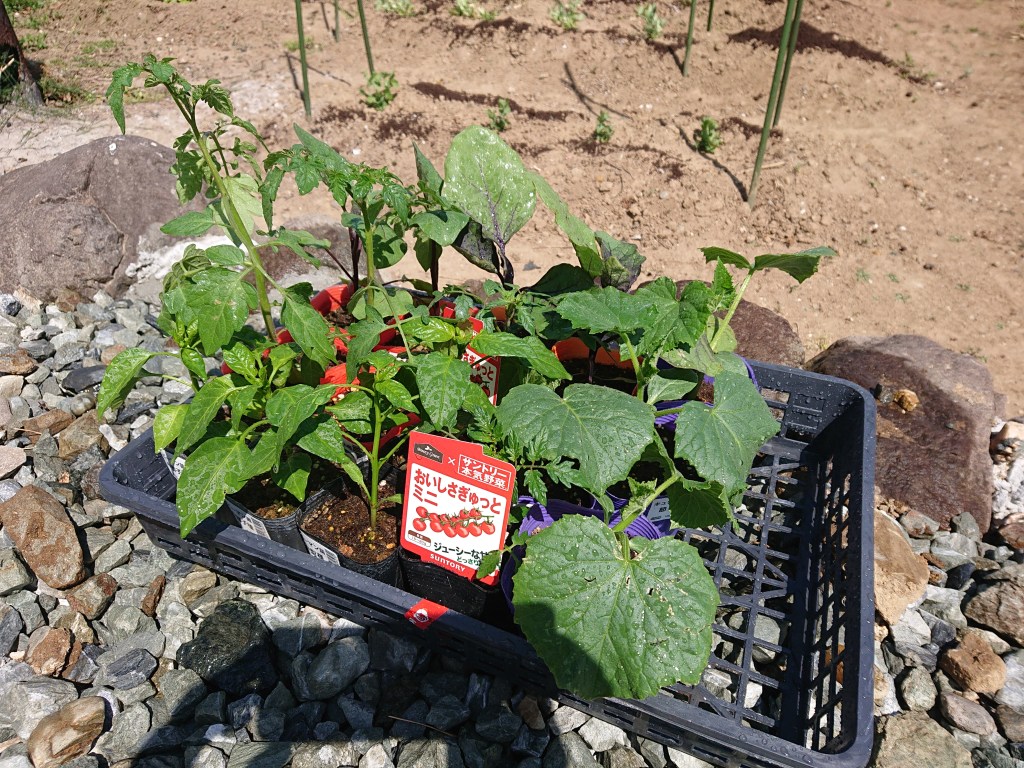 キュウリ、ナス、ピーマン、ミニトマト、それぞれ4株ずつ。