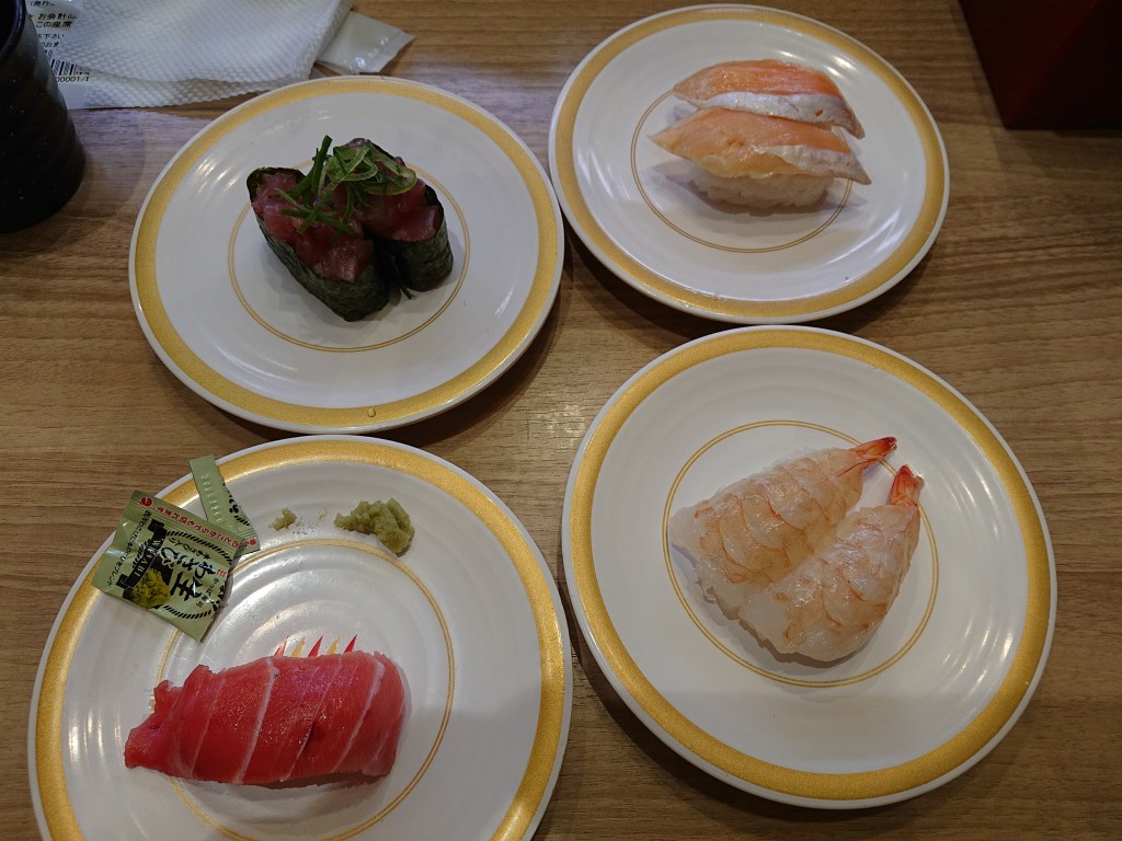 生エビ、カンパチ、まぐろぶつ軍艦、中トロ、イワシ、トロサーモン、焼きサーモンの7皿でした。