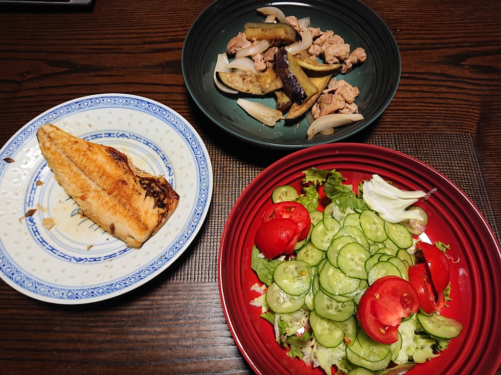 昨日の夕食は、塩サバ、肉野菜炒めでした。