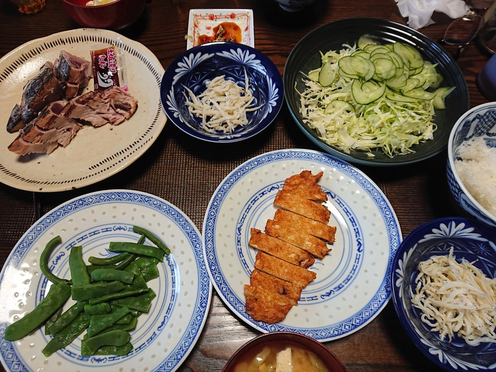 昨日の夕食は、カツオのたたき、イカ揚げ、釜あげしらうおでした。