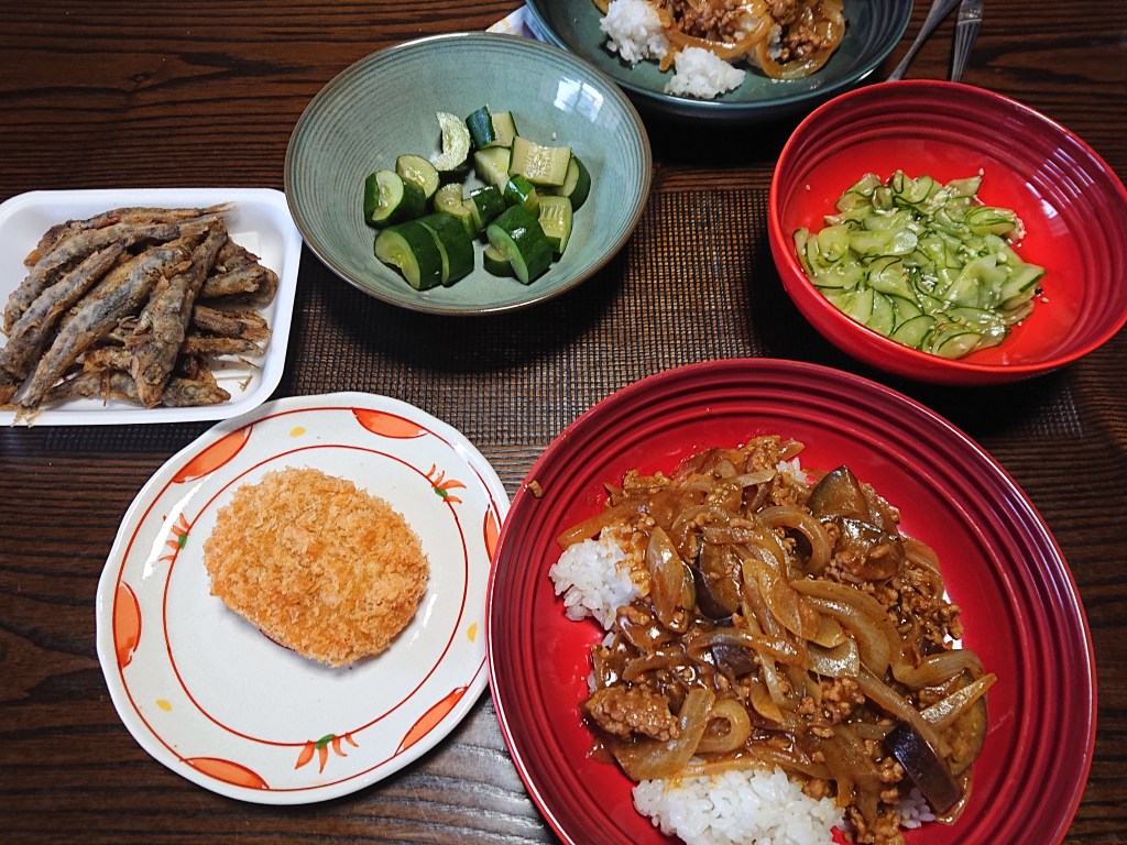 また、地元の個人商店で買った、牛肉コロッケ、メヒカリのから揚げ。