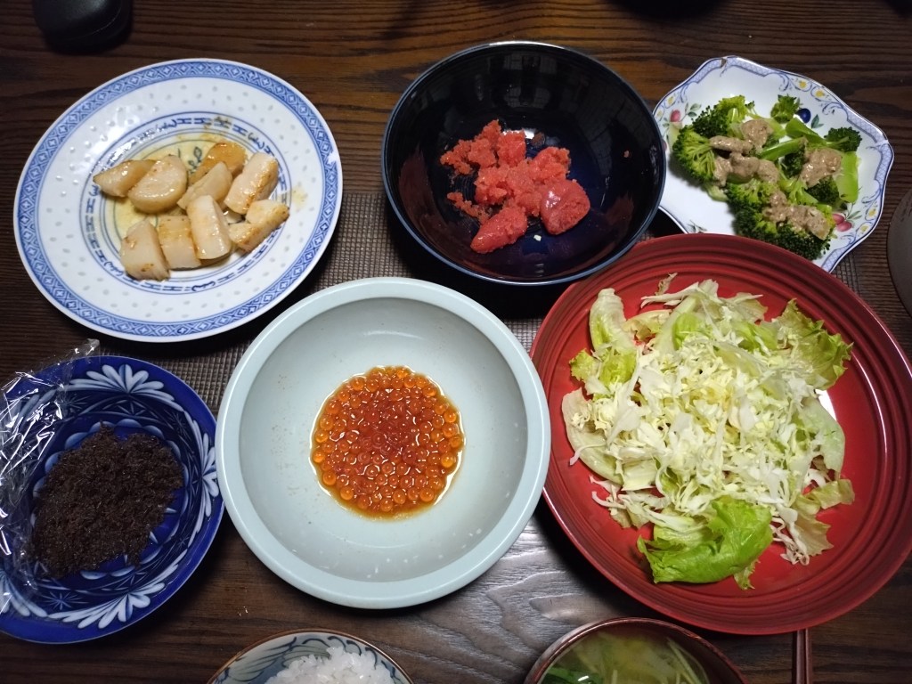 昨日の夕食は、イクラ、タラコ、ホタテのバター焼きでした。