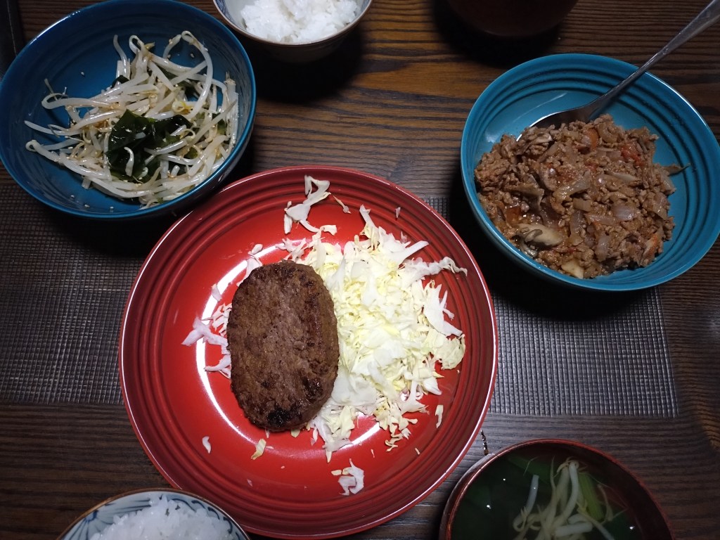 昨日の夕食は、ミートソース風ひき肉炒め、ハンバーグでした。
