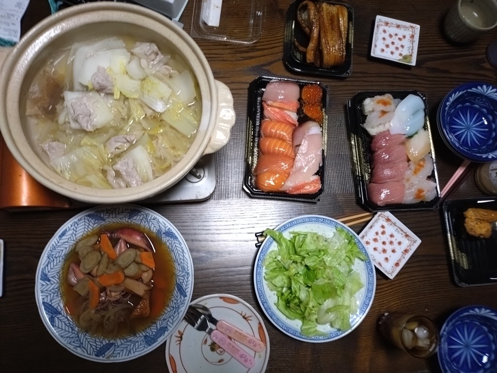 夕食は、寿司と鍋。