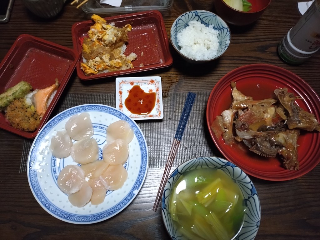 メヌケの煮付けは父が作り、ホタテは冷凍ものを解凍したものです。