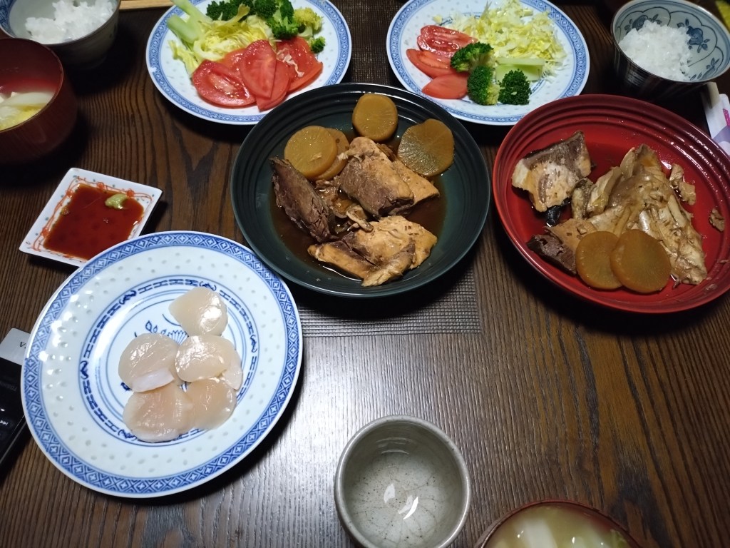 サラダやホタテの刺身などを出し、父はいつも以上に気合いが入り、ブリ大根を作りました。