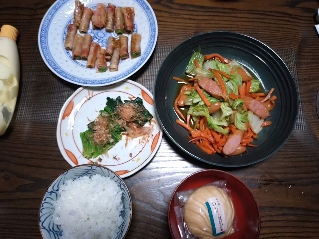 昨日の夕食は、アスパラベーコン巻き、ソーセージとキャベツ炒めでした。