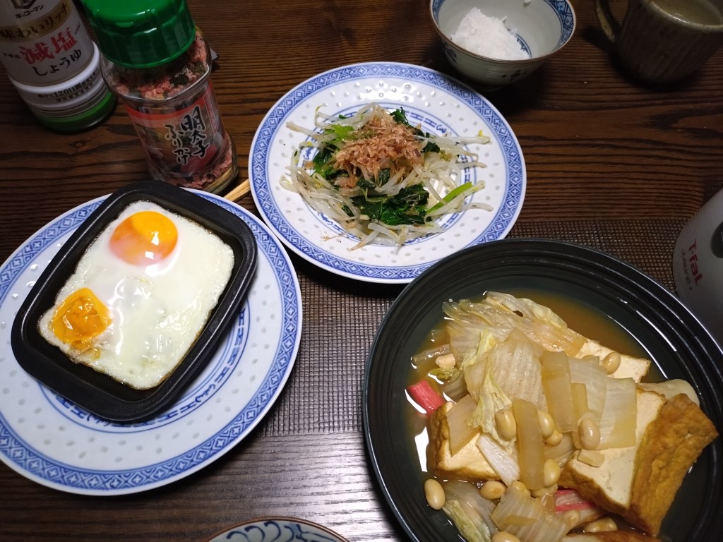 昨日の夕食は、目玉焼き、煮物でした。