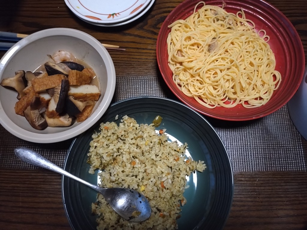 昨日の夕食は、冷凍チャーハンと、レトルトのたらこスパゲティでした。