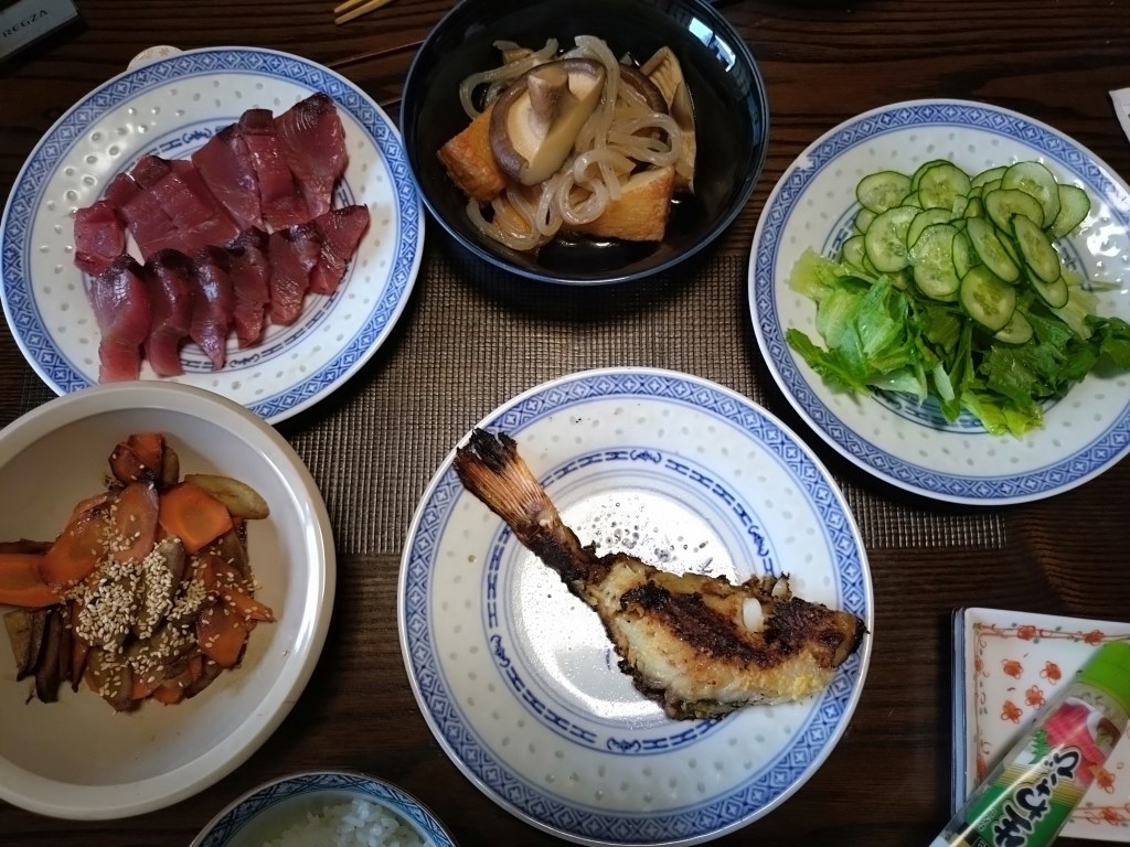 一昨日の焼き魚、煮物の余りもあり、盛りだくさんでした。