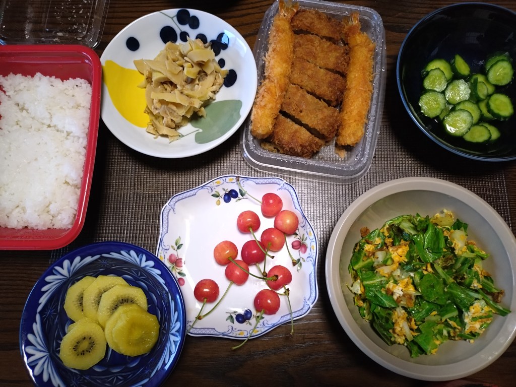 他には、卵キャベツ炒め、もらいもののタケノコ料理、キュウリの漬物。