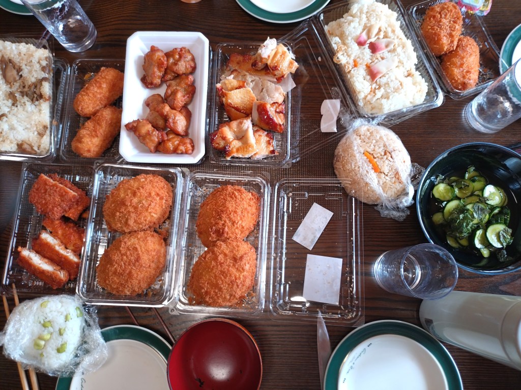 昼食は、地元スーパーの惣菜コーナーで買い揃えました。