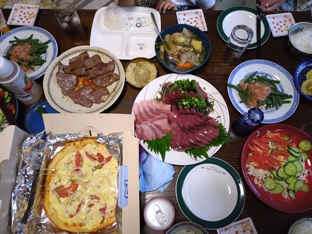 夕食は、姉が仙台で買ってきた国産牛、ヨークベニマルの刺身、父が作った肉じゃが、採れたてのインゲン。