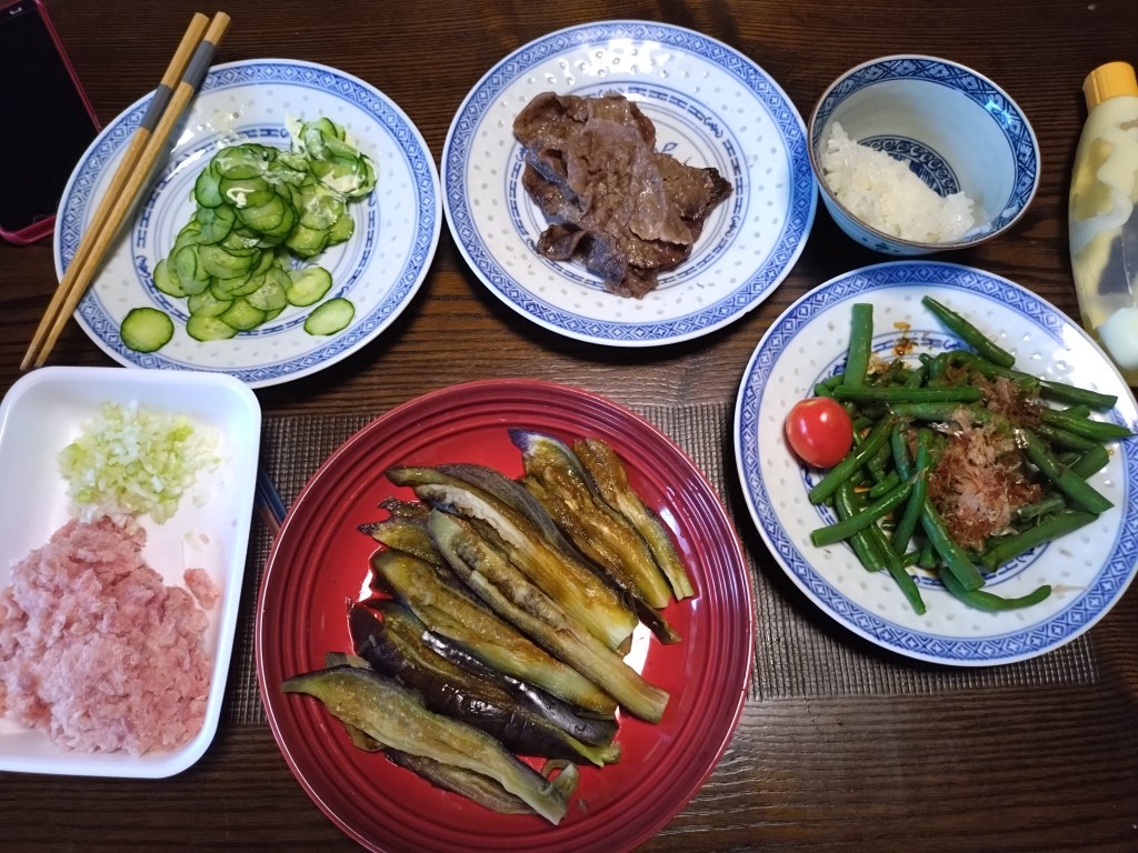 あとは、我が家の採れたてのインゲン、キュウリ、ナス。