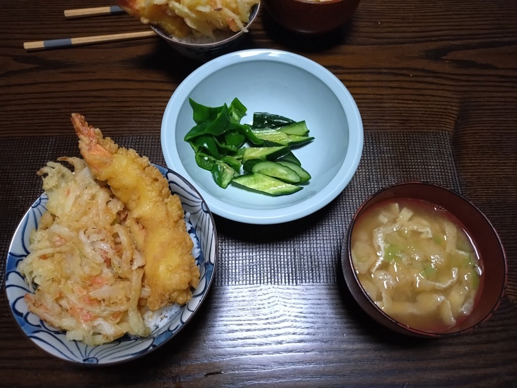 昨日の夕食は、地元スーパーの天ぷらを使った、自家製天丼でした。