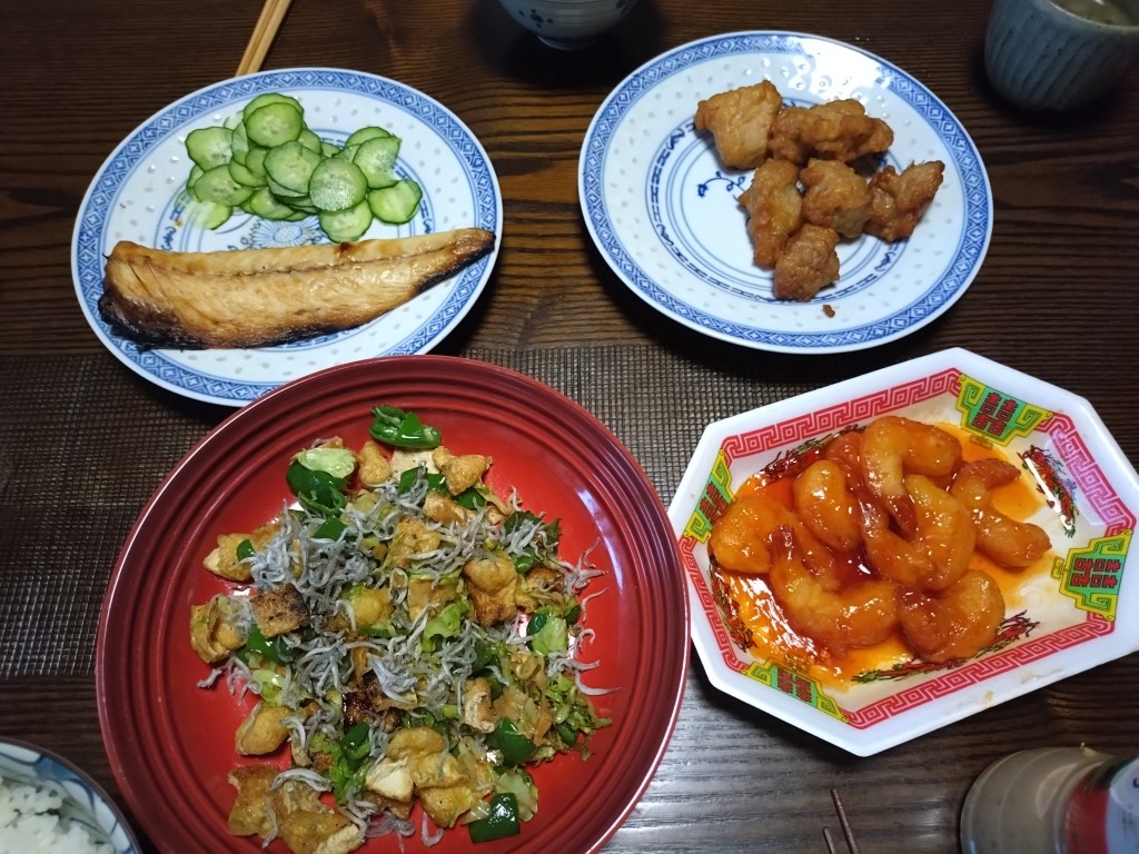 昨日の夕食は、サバの塩焼き、(火)鶏のから揚げ、エビチリでした。